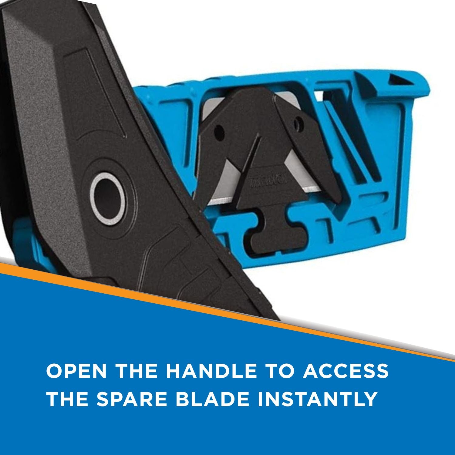 Spare Blade in Storage: Changing the blade is simple and safe! Just follow the arrow’s guidance. Open the blue inner side of the knife to access the spare blade, and the mounted blade will automatically unlatch at the same time.
